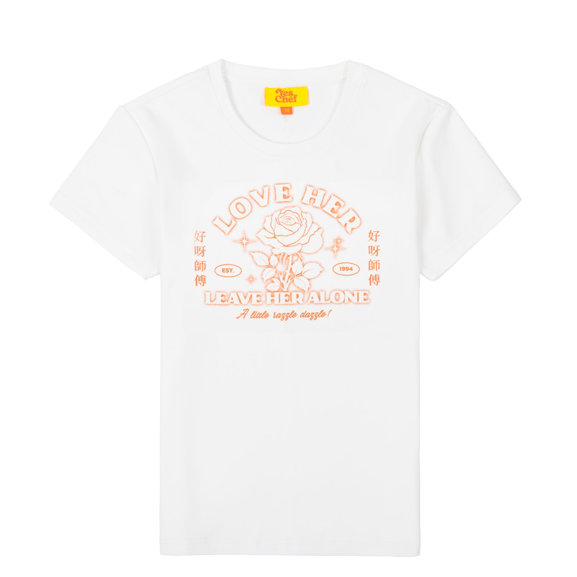 Love Her, Leave Her Alone. This baby tee was a major hit, so we brought it back in a big way! This micro-ribbed baby tee is now offered in a crisp white with red graphics for a subtle take on a Yes Chef classic.